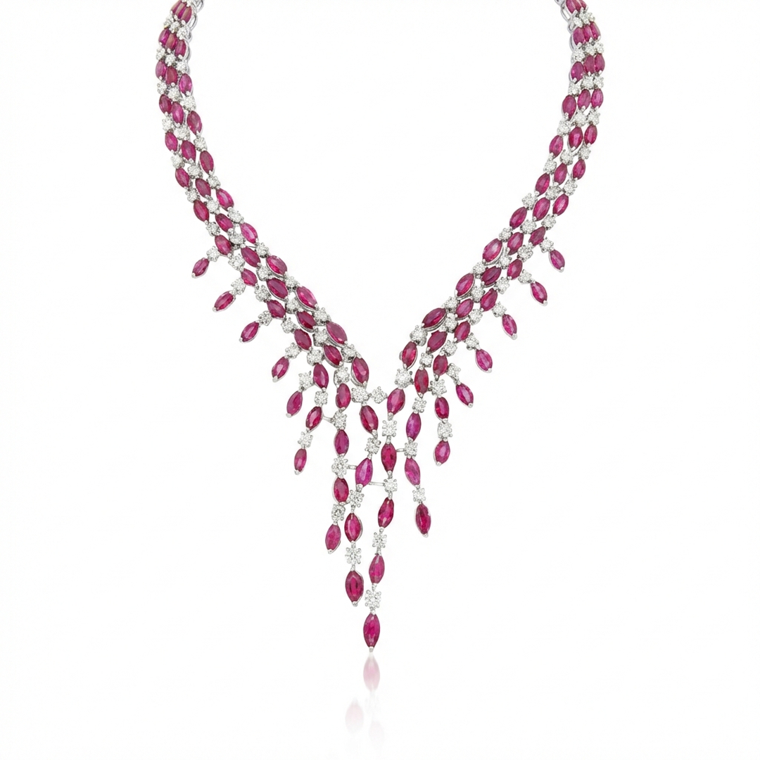 This exquisite necklace, crafted in 18K White Gold, features 40.71ct Natural Burma Ruby Marquise and 10.03ct Round Natural Diamonds in a cascading elegant asymmetrical flow design. The graduated arrangement accentuates the neckline with vibrant hues and brilliance. Complementing the necklace, a matching pair of earrings to create a complete and harmonious set, perfect for special occasions.
