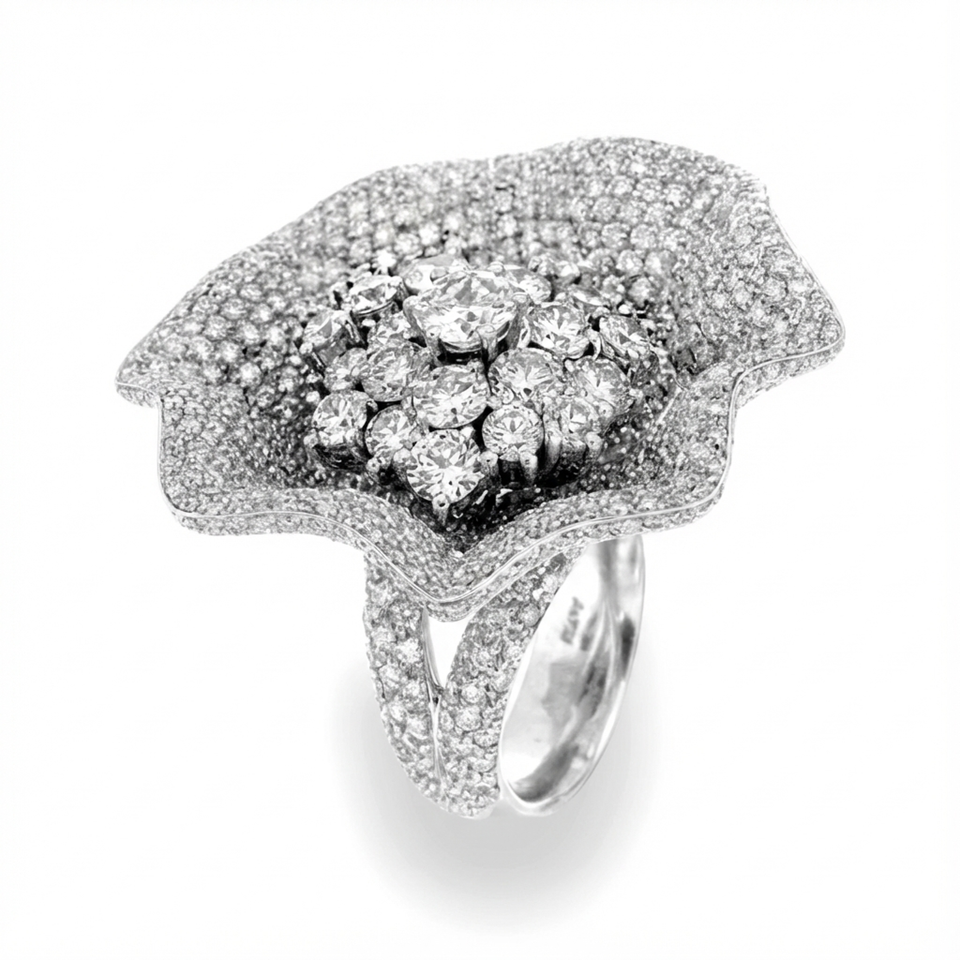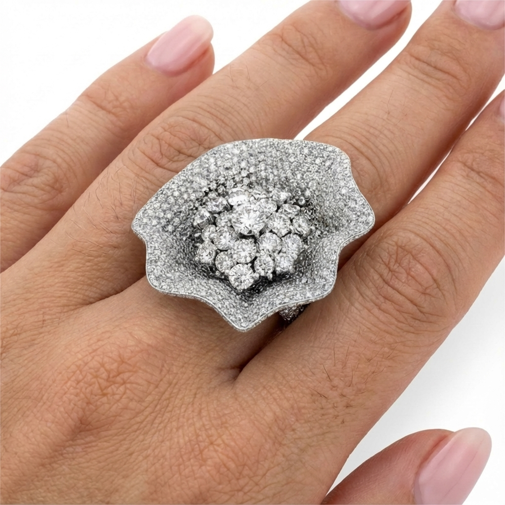 Crafted in 18K white gold, the Arges Bouquet features a certified 0.91-carat Round Arges diamond (HRD GSI2) as its striking centerpiece. Encircled by 16.50 carats of premium natural Round Brilliant diamonds in a precisely calibrated setting, this ring delivers exceptional optical performance and enduring elegance.